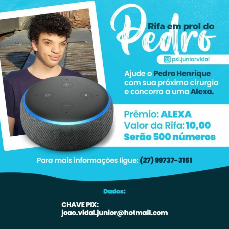 O prêmio da rifa será uma Alexa Echo Dot, uma moderna caixa de som com assistente virtual que pode ser integrada a outros equipamentos compatíveis, também utilizada em automações residenciais. Os bilhetes estão sendo vendidos à R$10,00. A data para realização dos sorteio ainda não foi definida, pois é preciso vender os 500 bilhetes que vão ajudar a custear a cirurgia, mas será divulgada por meio do Instagram do pai, @psi.juniorvidal.