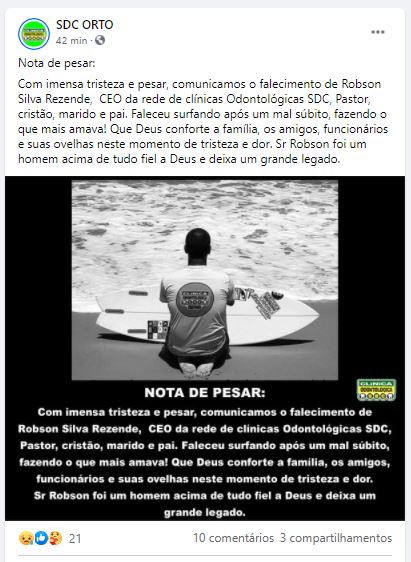 Robson Baião fundou em Guarapari o Seminário Surfistas de Cristo, há 30 anos. Algum tempo depois, também fundou a Clínica Odontológica SDC. Por meio das redes sociais, a Clínica divulgou uma nota de pesar pelo falecimento do surfista.