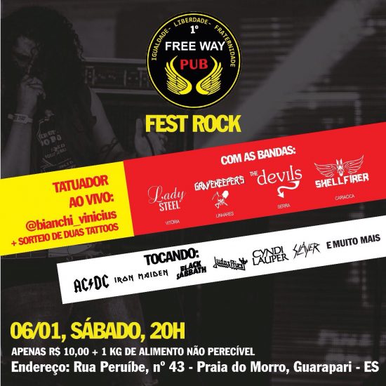 Amanhã (06/01), a partir das 20h, acontece o 1º Free Way Fest Rock. O evento promete agitar a cidade em uma mistura de rock and roll e solidariedade. A música fica por conta dos shows das bandas capixabas The Devils (Serra), Lady Steel (Vitória), Gravekeeeper’s (Linhares) e Shellfirer (Cariacica), tocando o melhor de AC/DC, Iron Maiden, Black Sabath, Cyndi Lauper e muito mais. E não para por aí, sorteio de duas “flashes tattoos” que poderão ser feitas no local.