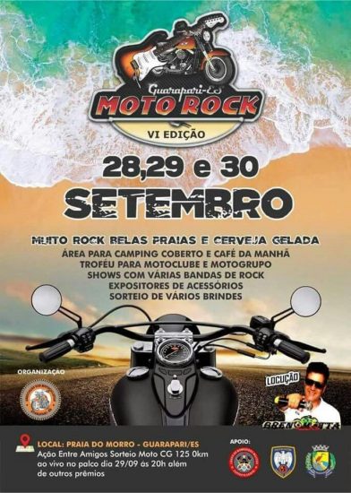 O final de semana promete muito ronco de motor e Rock’n Roll em Guarapari. A VI edição do Guarapari Moto Rock acontece de sexta-feira (28) a domingo (30) na área do parque de diversão na Praia do Morro. O evento é promovido pela Associação dos Motociclistas de Guarapari (AMG) presidida por Marcelo Tedesco.