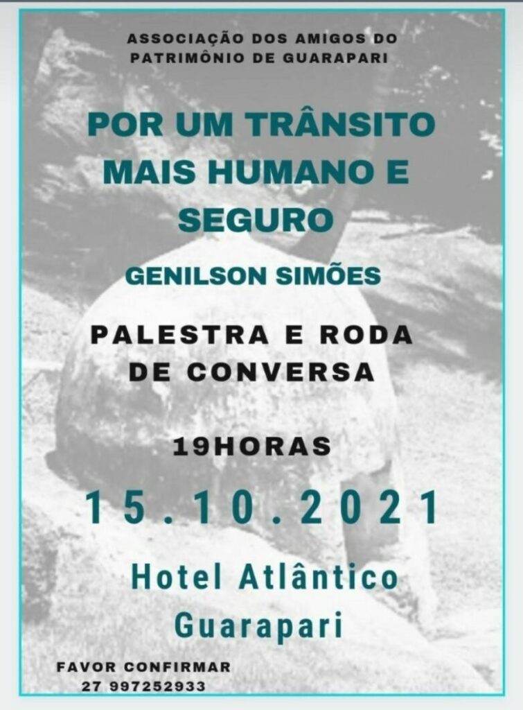Nesta sexta-feira (15), a Associação de Amigos e Protetores do Patrimônio de Guarapari realiza um encontro com palestra e roda de conversa com o tema “Por um Trânsito Mais Humano e Seguro”, com Genilson Simões, especialista em Direito do Trânsito que, por 15 anos, atuou como chefe no Ciretran em Guarapari, quando foi também responsável pela campanha “Guarapari Pela Paz”.