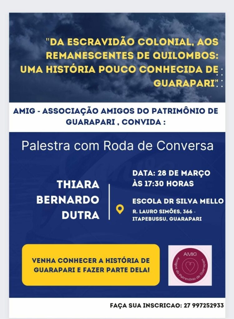 Na próxima segunda-feira (28), a Associação Amigos do Patrimônio de Guarapari (Amig)vai realizar uma palestra e roda de conversa com o tema “Da Escravidão Colonial aos Remanescentes de Quilombos: uma História Pouco Conhecida de Guarapari”, com doutoranda e mestre em História pela Universidade Federal do Espírito Santo (Ufes), Thiara Bernardo Dutra.