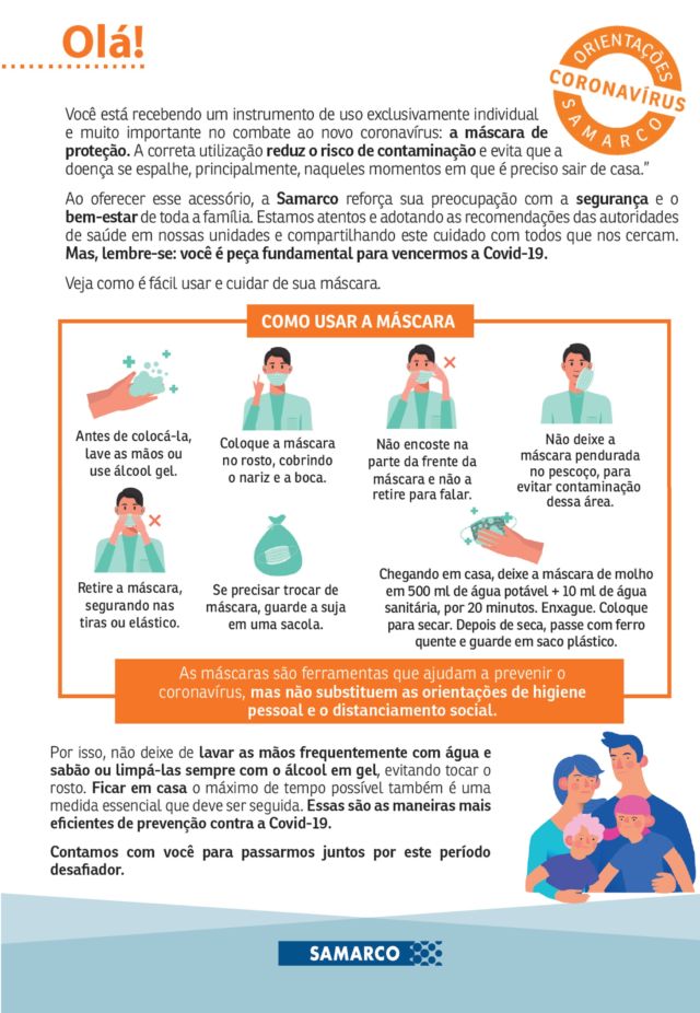 A Samarco já forneceu máscaras de tecido para todos os empregados próprios e seus familiares e também para terceiros mobilizados em seus complexos industriais. O uso de máscaras pela população é recomendado por autoridades de saúde, pois funcionam como barreira física que dificulta a disseminação de gotículas expelidas pelo nariz ou pela boca do usuário no ambiente. Em diversas cidades, sua utilização passou a ser obrigatória para circulação em vias públicas e acesso a estabelecimentos públicos, comerciais e bancários.
