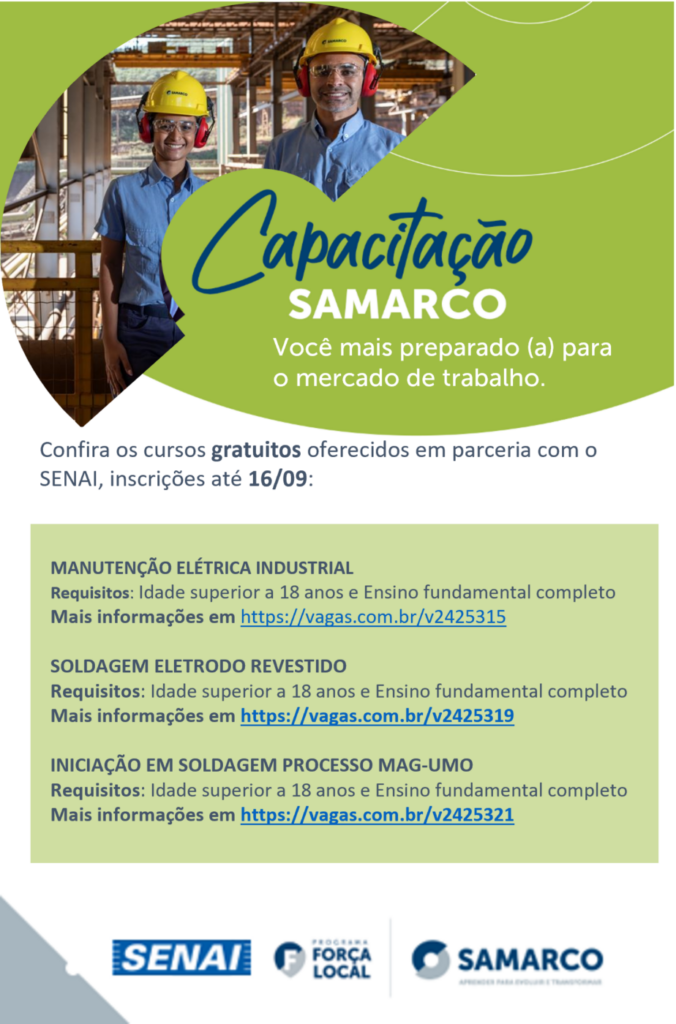 A Samarco está oferecendo vagas para cursos gratuitos de qualificação profissional para moradores de Guarapari, Anchieta e Piúma, por meio do programa Força Local. As oportunidades são para soldagem eletrodo revestido, iniciação em soldagem processo Mag e manutenção elétrica industrial. São oferecidas 56 vagas, distribuídas entre as três áreas, em parceria com o Serviço Nacional de Aprendizagem Industrial (Senai). As inscrições devem ser realizadas pelo portal Vagas.com até o dia 16 de setembro.