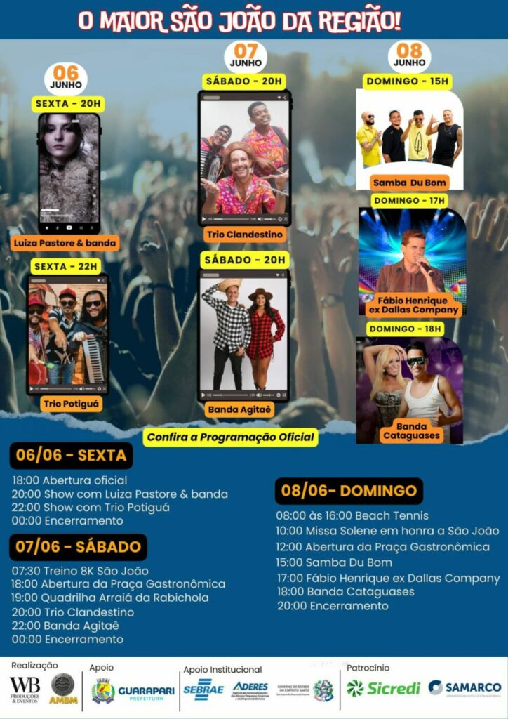 A programação inclui shows de forró pé de serra, sertanejo, pagode e música junina, além de quadrilhas animadas, torneio de beach tênis, treino de corrida, espaço kids e uma missa solene em homenagem a São João.
