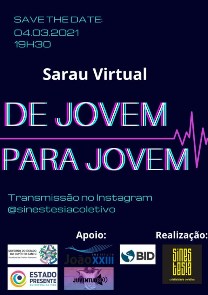 O Sarau Virtual “De Jovem para Jovem” é um desdobramento do Edital JuventudES Emergencial, da Secretaria de Direitos Humanos do Governo do Estado. A iniciativa do Sinestesia foi uma das selecionadas pelo Edital e vai reunir a apresentação de dez artistas de bairros periféricos de Guarapari.