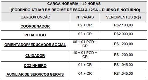 Os profissionais selecionados cumprirão carga horária de 40 horas semanais em escala 12/36. Ao todo, serão preenchidas 28 vagas imediatas de ampla concorrência e 2 específicas para pessoa com deficiência (PCD). Também haverá formação de cadastro de reserva para todas as funções. As vagas e as remuneração estão distribuídas conforme o quadro abaixo.