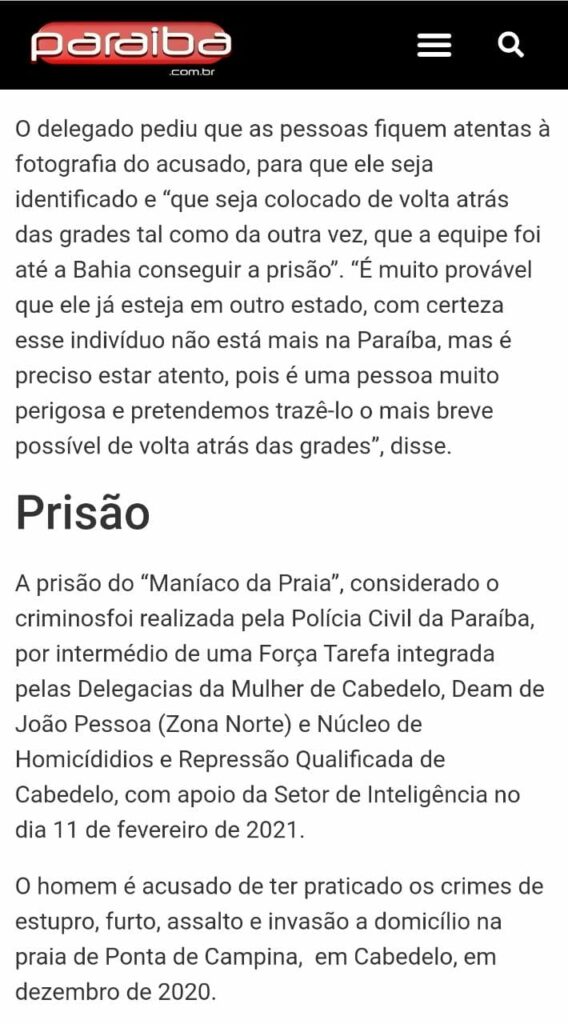 Conhecido com “maníaco da praia”’, é acusado de cometer crimes de estupro, furto, assalto e invasão a domicílio
