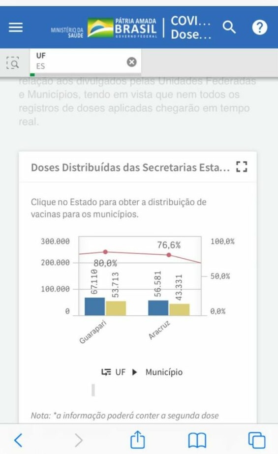 Nessa segunda-feira (21), a Secretaria de Estado da Saúde (Sesa) informou que 15 municípios capixabas receberam somente 50% das doses previstas para continuar com a imunização dos moradores contra o novo Coronavírus (Covid-19). Segundo a Secretaria, Águia Branca, Aracruz, Cachoeiro de Itapemirim, Colatina, Conceição do Castelo, Governador Lindenberg, Guaçuí, Guarapari, Ibitirama, Itaguaçu, Mimoso do Sul, Muqui, Piúma, São Mateus e Vargem Alta, não atingiram a meta de 80% na aplicação das vacinas que têm disponíveis.