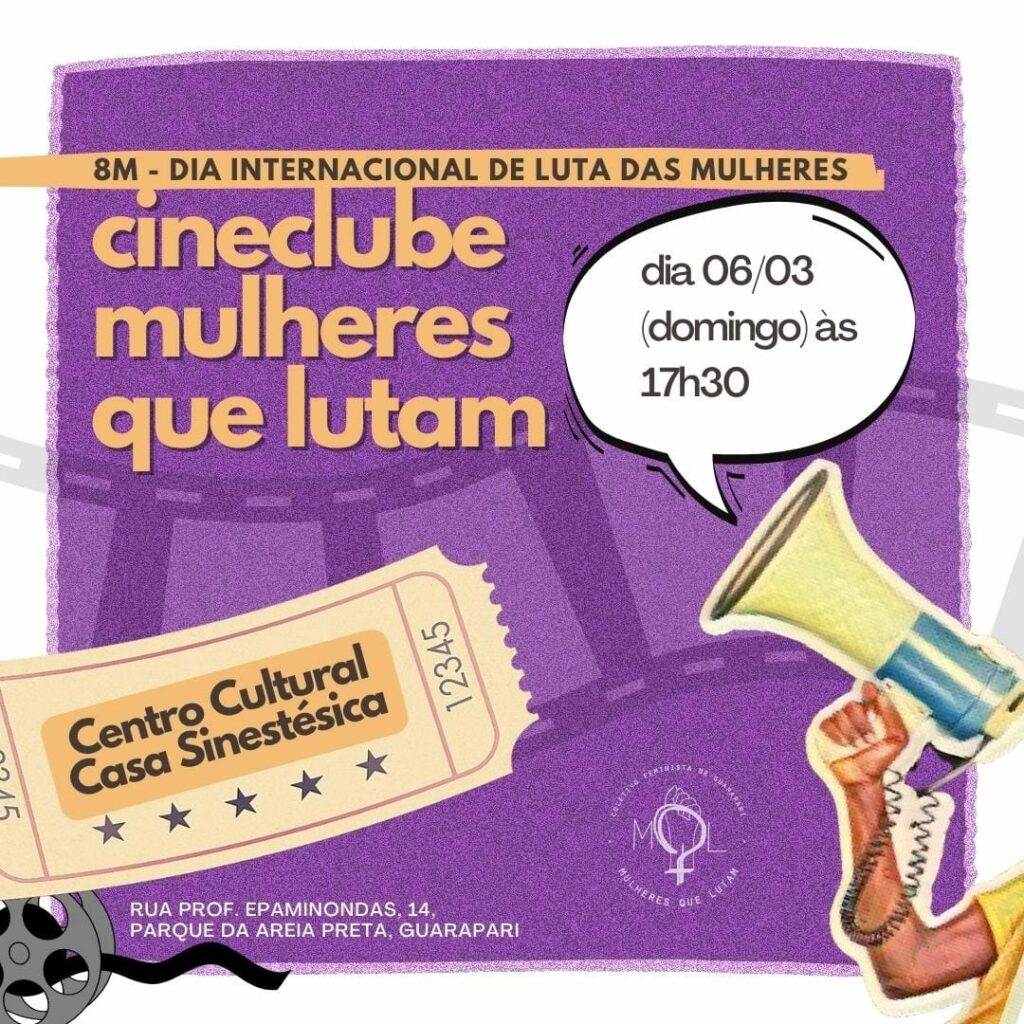 O Cineclube Mulheres Que Lutam acontece neste domingo (08), às 17h30, no Centro Cultural Casa Sinestésica, localizada na rua Prof. Epaminondas, n° 14, no bairro Parque Areia Preta.