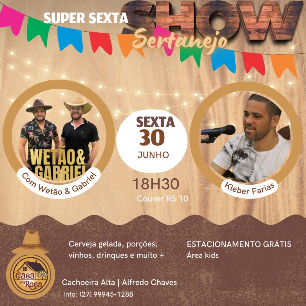 Acontece nessa sexta-feira (30) o “Show Sertanejo”, evento com apresentações musicais, comidas e bebidas a partir das 18h30 na Casa da Roça, em Cachoeira Alta, Alfredo Chaves.