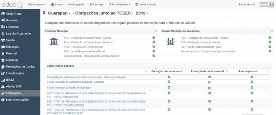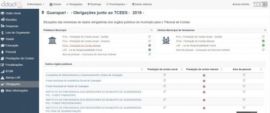 Em consulta a plataforma CidadES, do Tribunas de Contas do Estado do Espírito Santo (TCE-ES), Guarapari aparece entre os municípios com a Prestação de Contas Mensal (PCM) em atraso, o que compromete as transferências voluntárias do Estado, como convênios, já que, nesta situação, a Certidão de Transferências Voluntárias é emitida com indicativo de pendência, conforme esclarecimentos do coordenador do Núcleo de Contabilidade e Economia do TCE-ES, Romário Figueiredo, em nota.