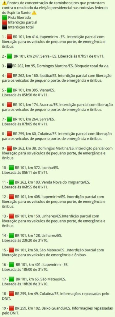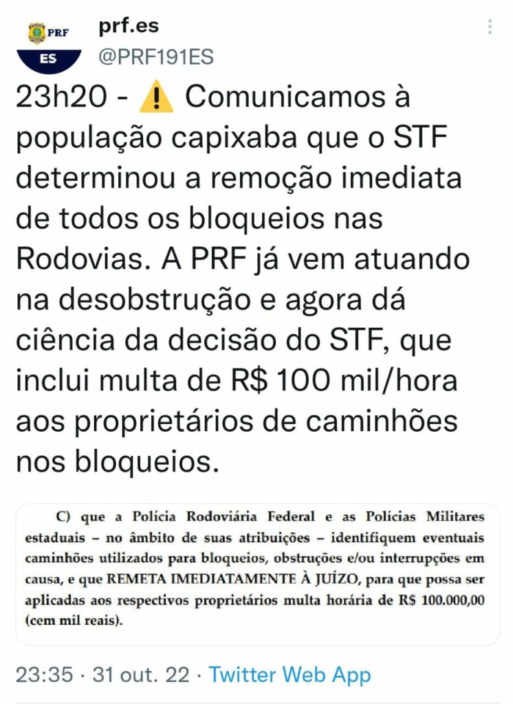 Na parte da noite, a PRF/ES comunicou, através da rede social, a decisão do Supremo Tribunal Federal – STF que determinou a remoção imediata de todos os bloqueios nas rodovias, incluindo multa de R$ 100 mil por hora para os proprietários de caminhões nos bloqueios.