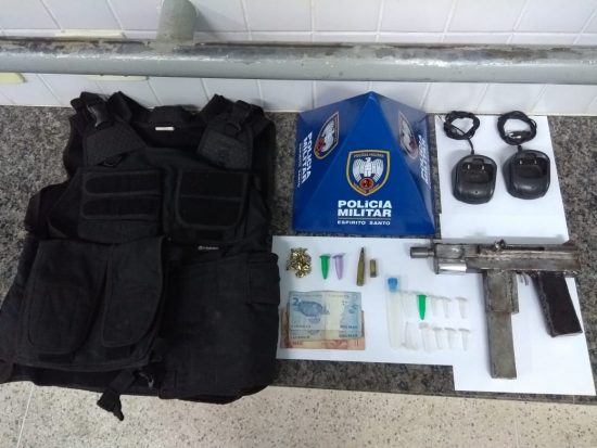 Na noite dessa terça-feira (10), durante o patrulhamento preventivo em Amarelos, área rural de Guarapari, militares avistaram um individuo em uma moto em atitude suspeita. Com ele, foram encontrados dois pinos de cocaína. Em seguida, na residência do abordado foram encontrados uma submetralhadora de fabricação caseira calibre 380, um cartucho de munição calibre 762 intacta, dois suportes para rádios comunicadores e uma capa para colete balístico.
