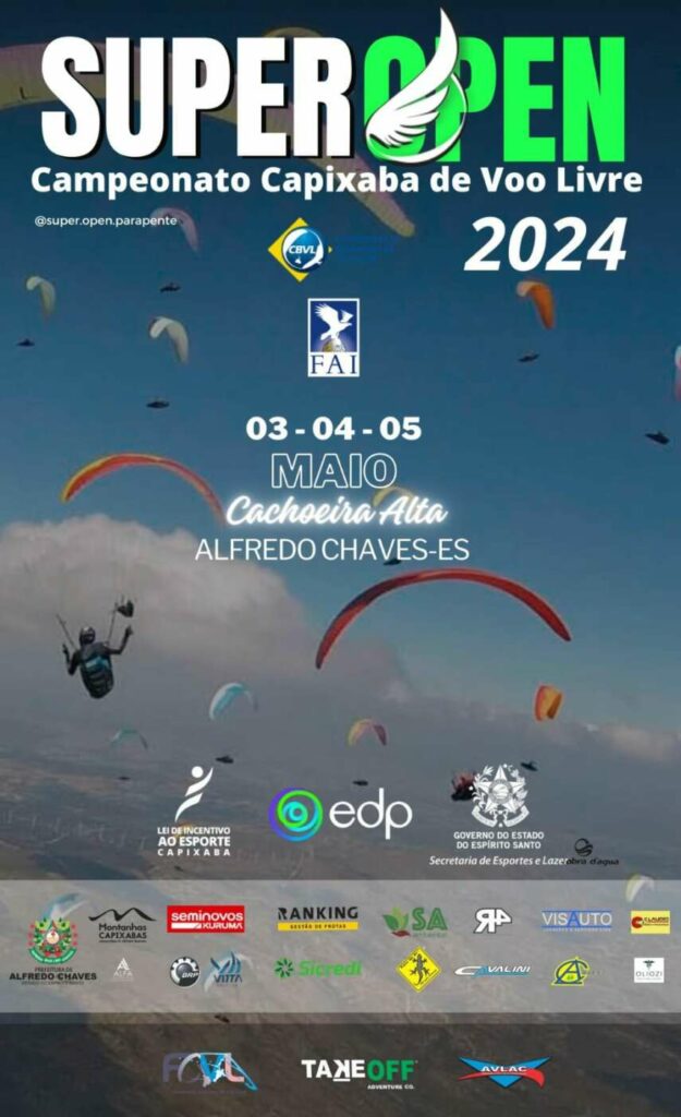 A 3ª Edição do SUPER OPEN abre as portas para os pilotos que desejam participar do Campeonato Brasileiro de Parapente. Neste ano, o evento conta com o patrocínio da EDP, distribuidora de energia elétrica do Espírito Santo, por meio da Lei de Incentivo ao Esporte Capixaba (LIEC) do Governo Estadual.