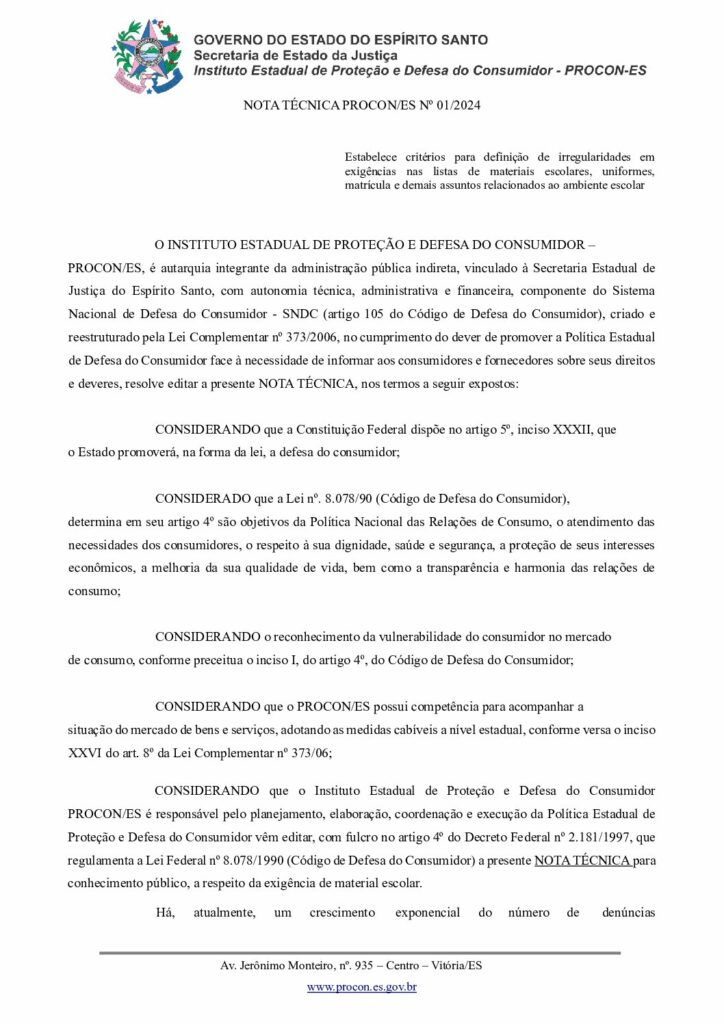 Ewerton: Não pode ser pedido pela escola os materiais de uso coletivo ou administrativo, como álcool (gel ou líquido), cartolina, grampeador, EVA e todos os itens do anexo 01 da NOTA TÉCNICA PROCON/ES Nº01/2024.