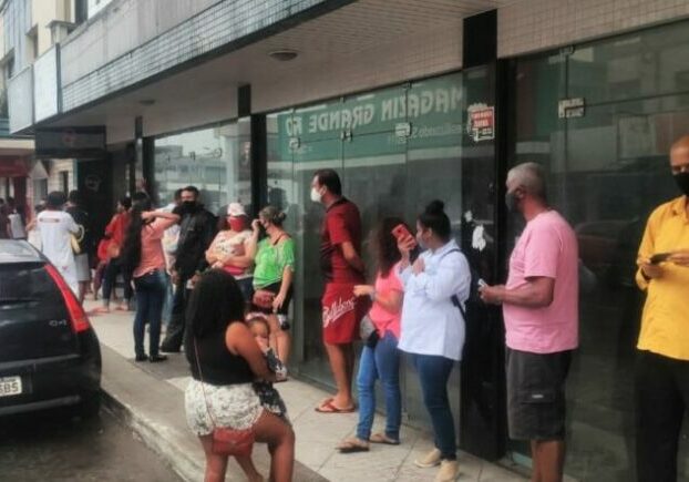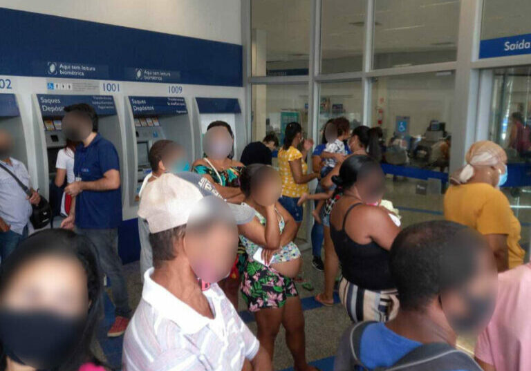 A fila se formou na área do caixa eletrônico e se estendeu até o lado de fora da agência. Pessoas de todas as idades e condições em pé e no sol