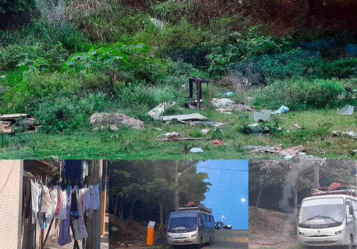 De acordo com o relato, no local há um terreno abandonado acumulando lixo, um ônibus estacionado na rua com uma família morando e calçada sendo usada como varal de roupa
