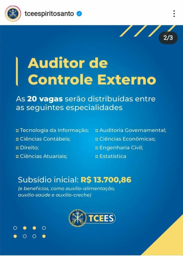 O salário inicial para auditor de controle externo no TCE-ES é de R$ 13.700,86, além de benefícios, como auxílio-alimentação, auxílio-saúde e auxílio-creche. Já para o cargo de conselheiro-substituto, o valor é de R$ 33.689,11.