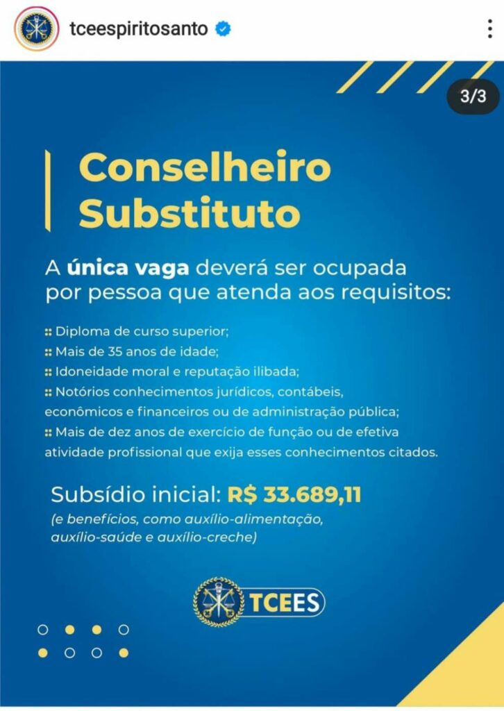 Já a vaga de conselheiro substituto deverá ser ocupada por pessoa com curso superior e que possua os requisitos exigidos para o cargo: mais de 35 anos de idade; idoneidade moral e reputação ilibada; notórios conhecimentos jurídicos, contábeis, econômicos e financeiros ou de administração pública; e mais de dez anos de exercício de função ou de efetiva atividade profissional que exija esses conhecimentos citados.