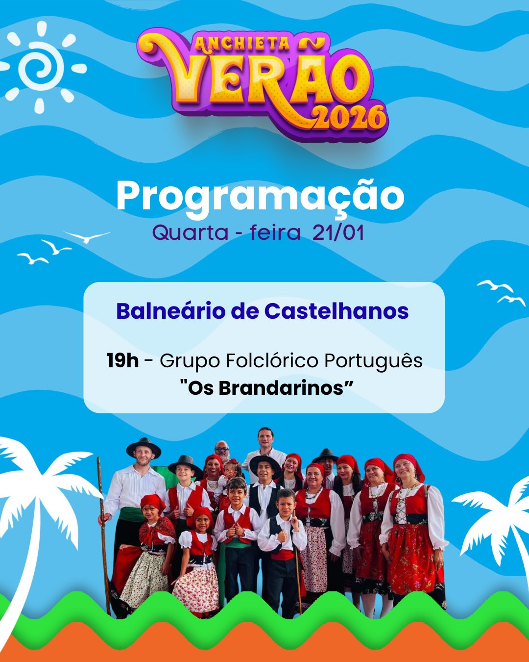 As atividades começam com a apresentação “Os Brandarinos”, no balneário de Castelhanos, nesta quarta-feira (21), a partir das 19h, prometendo encantar o público com uma proposta artística envolvente.