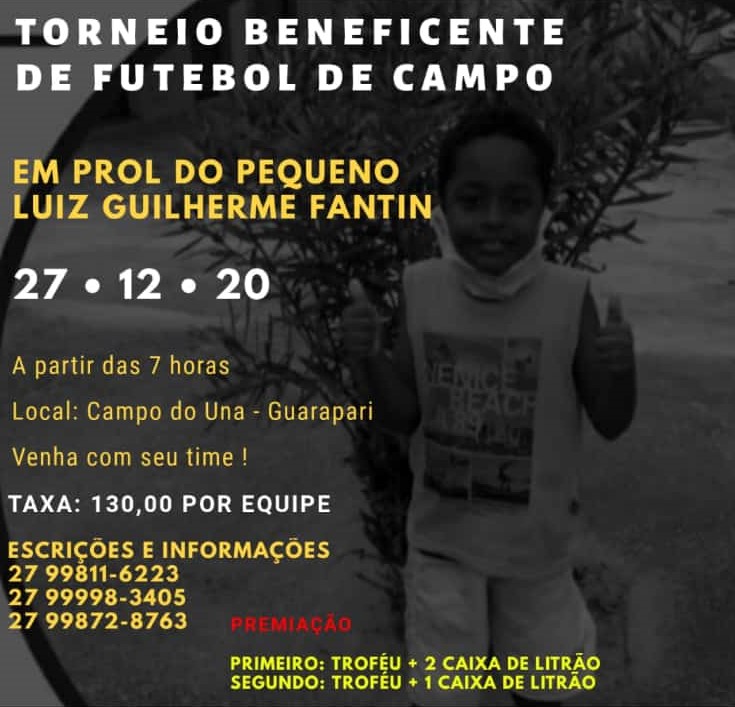 Amigos da família do menino Luiz Guilherme, de 8 anos, vão realizar um torneio de futebol no dia 27 de dezembro para arrecadar recursos para auxiliar nos custos do tratamento do menino. Luiz passou por um acidente vascular cerebral no dia 25 de novembro e segue internado no Hospital Infantil Nossa Senhora da Glória.