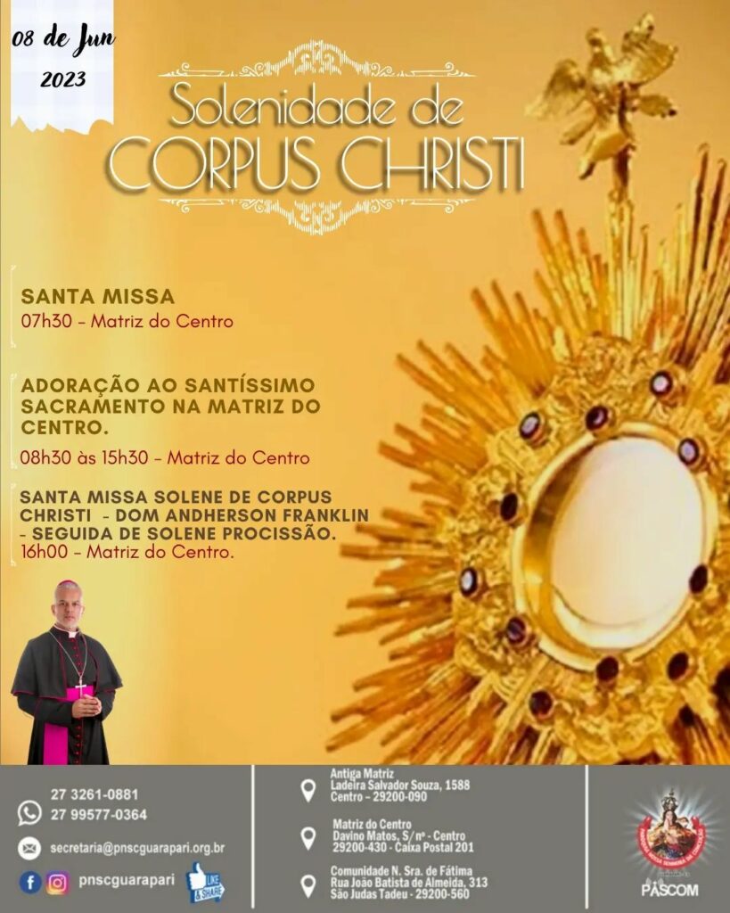 Para celebrar o feriado, a Paróquia Nossa Senhora da Conceição também planejou uma programação especial para os fiéis, com a Santa Missa a partir das 07h30, seguida pela Adoração ao Santíssimo, de 08h30 às 15h30, e com encerramento a partir das 16h com Santa Missa Solene de Corpus Christi com Dom Anderson Franklin, logo após haverá a solene procissão.