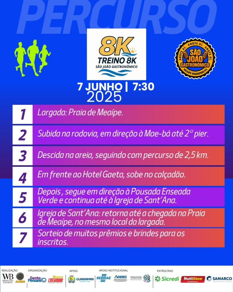 Dia 7 de junho, a partir das 7h30, a Praia de Meaípe, receberá o Treino 8K São João Gastronômico, uma atividade que une esporte, cultura e turismo em um só evento. Idealizado pela WB Produções e organizado pela Gente Pensando e Cassimiro Assessoria Esportiva, o treino integra a programação do Festival São João Gastronômico e espera reunir cerca de 150 participantes.