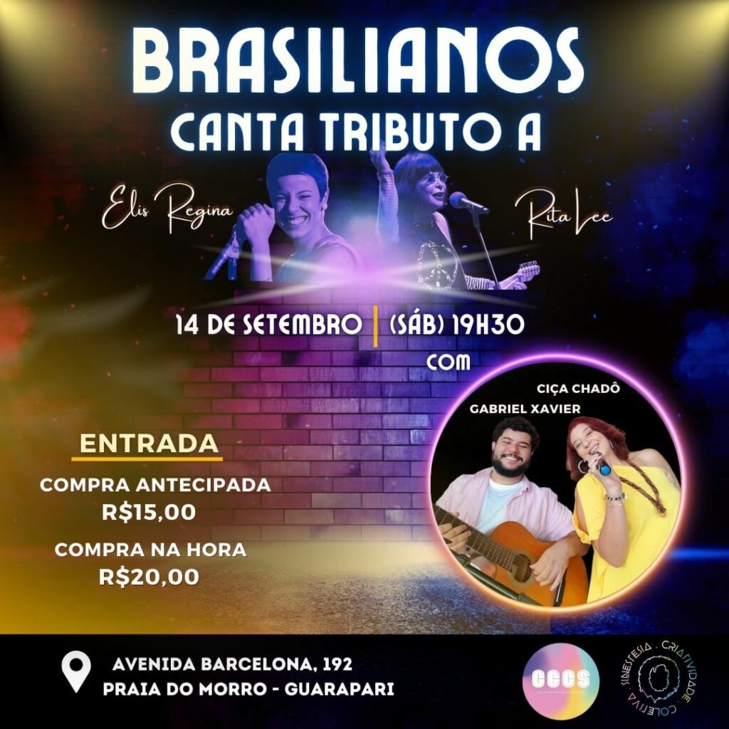 No dia 14 de setembro, às 19h30, Guarapari será palco de uma celebração ao legado de duas grandes lendas da música brasileira: Elis Regina e Rita Lee. O Centro Cultural Casa Sinestésica, na Praia do Morro, receberá a dupla Brasilianos, formada por Ciça Chadô e Gabriel Xavier, para uma noite especial que promete emocionar o público com canções inesquecíveis das artistas.
