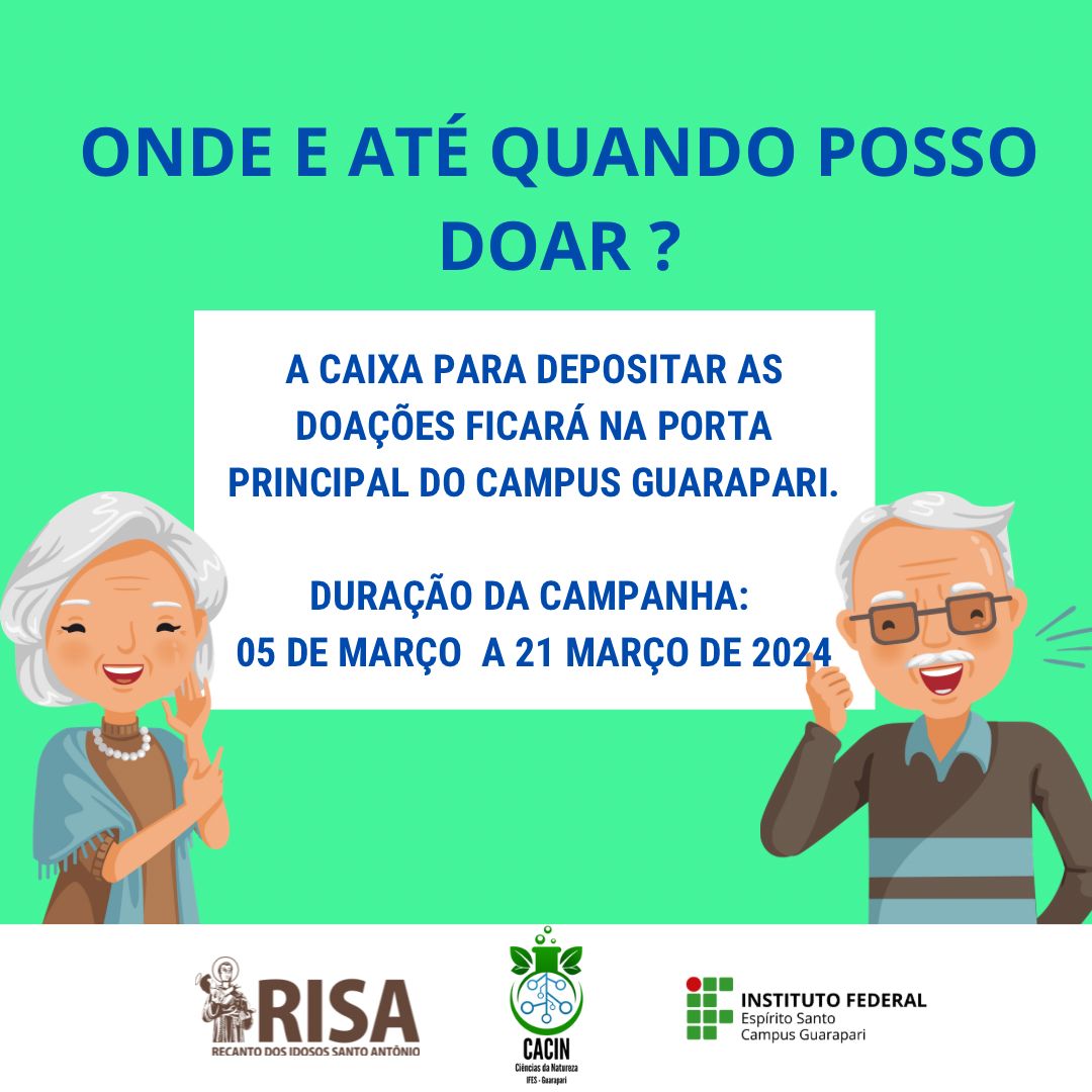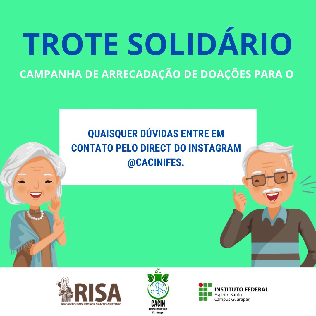 Iniciado no dia 05 de março, seguindo até o dia 21 do mesmo mês, o Trote Solidário, organizado pelos alunos do Instituto Federal do Espírito Santo – IFES Guarapari – está arrecadando material de higiene e limpeza, como fraldas geriátricas, toucas descartáveis, shampoos, sabonetes, entre outros, que serão destinados ao Recanto dos Idosos Santo Antônio – RISA.