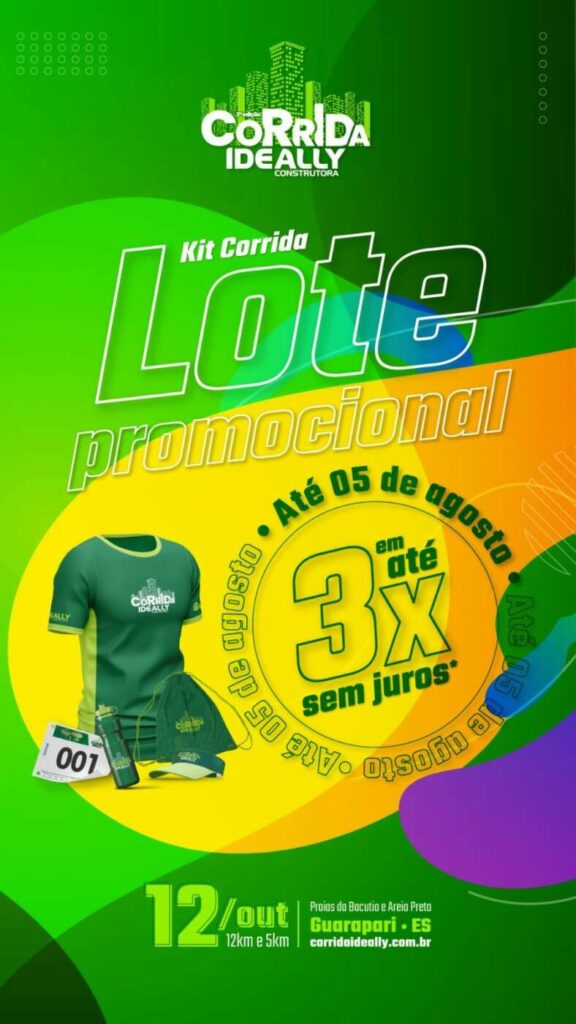 A 3ª edição da Corrida Ideally acontece em Guarapari no dia 12 de outubro, feriado de Nossa Senhora de Aparecida e terá 90% do percurso à beira mar. Até amanhã (05), os valores das inscrições estão com lote promocional: R$90,00 (Corrida) e R$40,00 (Corridinha), com camisa, parceladas em até 3x sem juros no cartão.