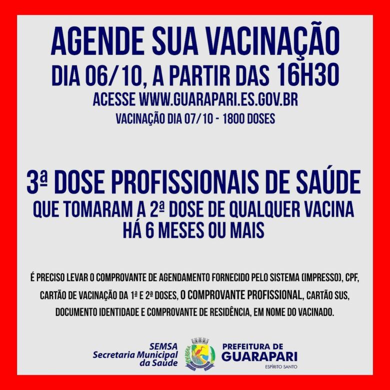 A Prefeitura de Guarapari (PMG) vai disponibilizar, na tarde desta quarta-feira (06), o agendamento para a aplicação de terceira dose da vacina da Covid-19 para profissionais de saúde que tenham tomado a 2ª dose do imunizante há seis meses ou mais.