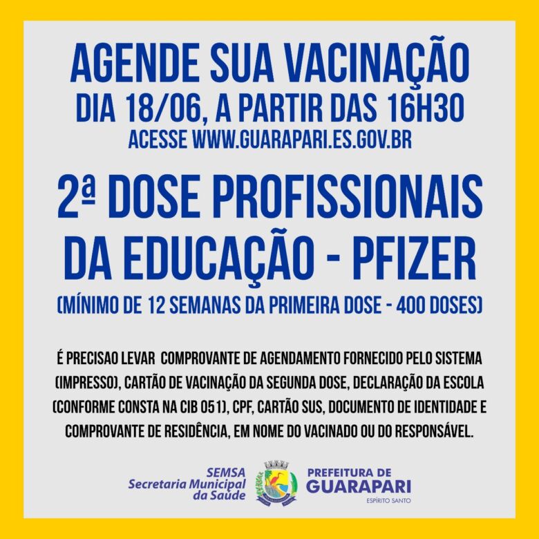 A Prefeitura de Guarapari, por meio da Secretaria Municipal de Saúde (Semsa), abre nesta quarta-feira (18), às 16h30, o agendamento exclusivo para profissionais de educação que precisam tomar a segunda dose da Pfizer.