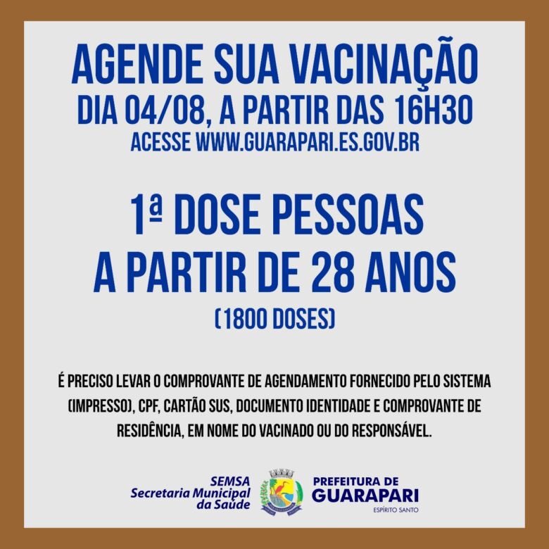 A Prefeitura de Guarapari, por meio da Secretaria Municipal de Saúde (Semsa), abre nesta quarta-feira (4), às 16h30, o agendamento para pessoas acima de 28 anos, que precisam receber a primeira dose da vacina contra a Covid-19.