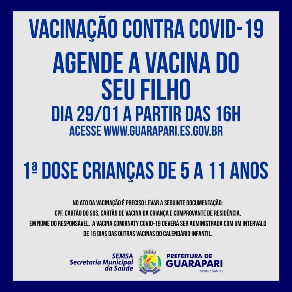 A Prefeitura de Guarapari, através da Secretaria Municipal de Saúde (Semsa), abre neste sábado (29), às 16h, o agendamento de vacinação para crianças de 05 a 11 anos, através do site do município.
