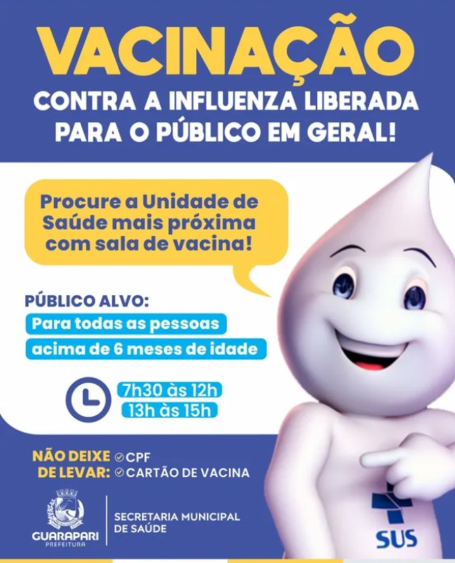 A Prefeitura de Guarapari, por meio da Secretaria Municipal de Saúde (Semsa), anunciou a ampliação da vacinação contra a Influenza para toda a população a partir dos seis meses de idade. A decisão segue a orientação da Secretaria Estadual da Saúde (Sesa), em acordo com os municípios capixabas, e tem como objetivo facilitar o acesso à imunização.