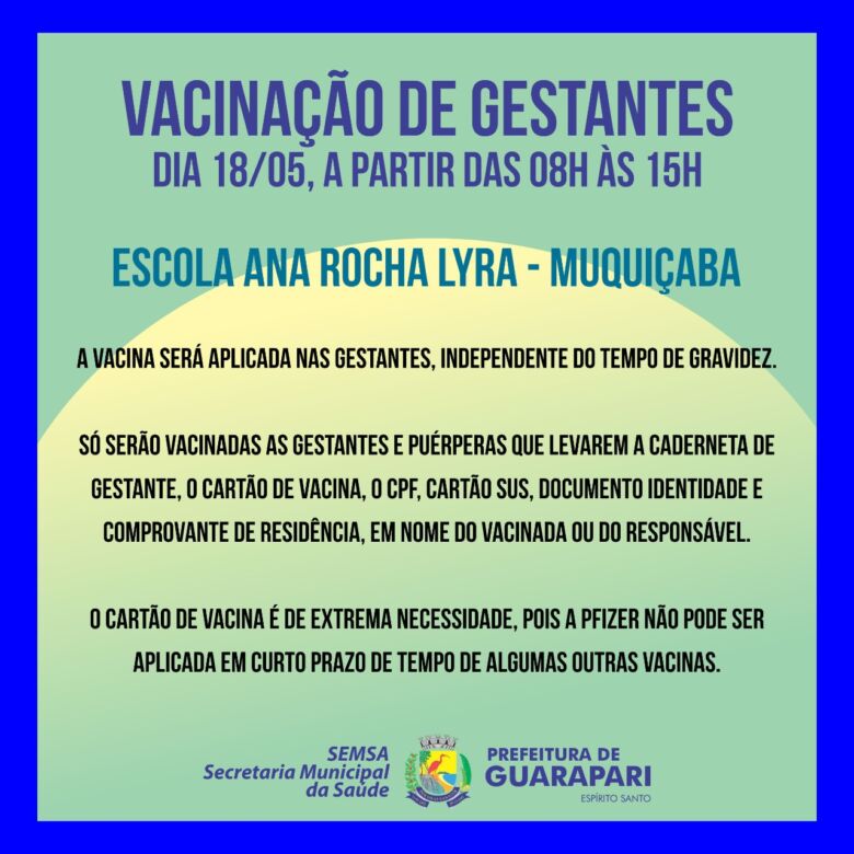A cidade de Guarapari foi uma das 14 selecionadas para realizar a vacinação de gestantes e puérperas (até 45 dias após a realização do parto), para os municípios mais próximos. Para esse público, a vacinação começa hoje (18), entre 8h e 15h, na Escola Ana Rocha Lyra, em Muquiçaba.