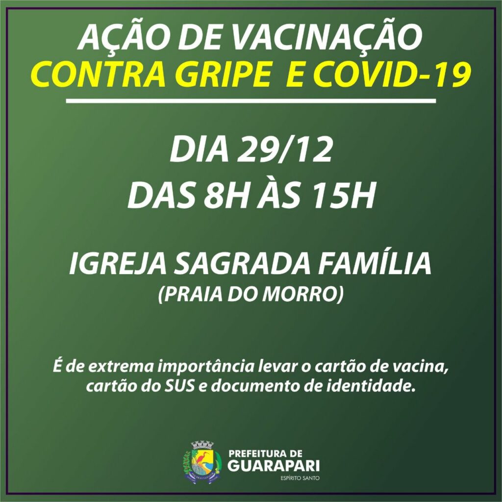 Nesta quarta-feira (29), a Prefeitura de Guarapari realiza mais uma ação de imunização na cidade. Desta vez, o local é a Igreja Sagrada Família, na Praia do Morro, onde serão disponibilizadas vacinas contra a Covid-19 e a Influenza, das 8h às 15h, sem necessidade de agendamento.