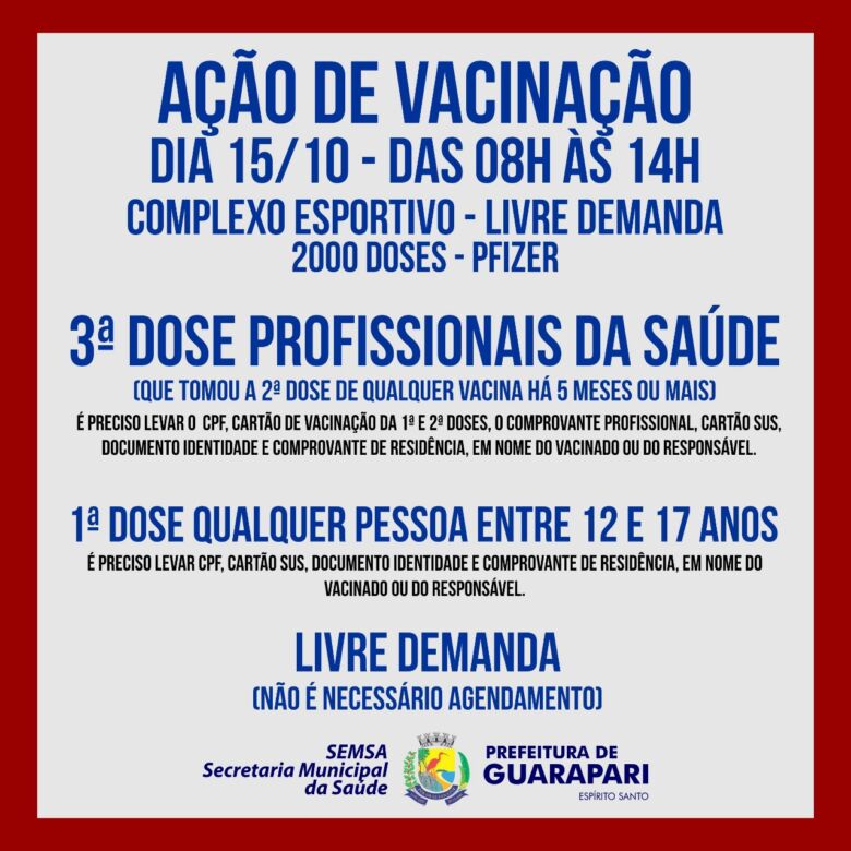 A Prefeitura de Guarapari, por meio da Secretaria Municipal de Saúde (Semsa), realiza nesta sexta-feira (15), mais uma ação de vacinação por livre demanda para jovens de 12 a 17 anos que precisam tomar a primeira dose e profissionais da saúde que irão receber a terceira dose.