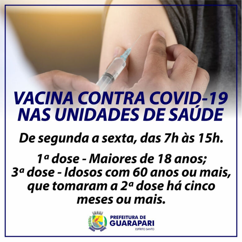 A Prefeitura de Guarapari, através da Secretaria Municipal de Saúde (Semsa), inicia uma nova fase da vacinação contra a Covid-19 para primeira e terceira dose. A partir de agora, as pessoas deste público podem procurar a unidade de saúde, que possui sala de vacina, no horário das 07h às 15h, de segunda a sexta-feira, para serem imunizadas. É importante lembrar que não há necessidade de chegar mais cedo nas unidades.
