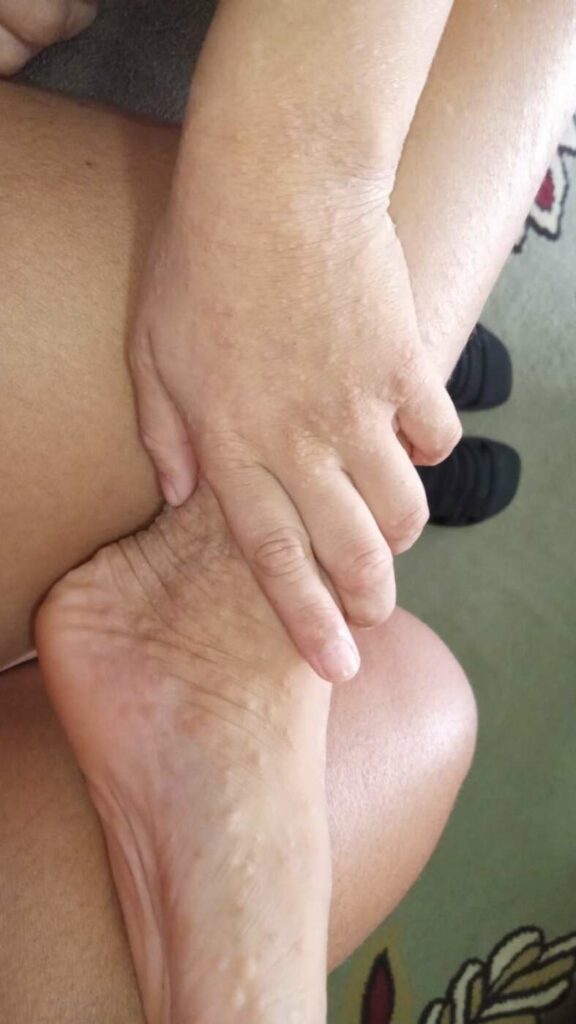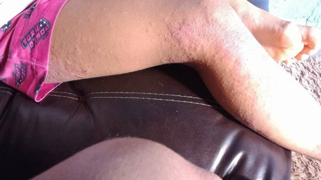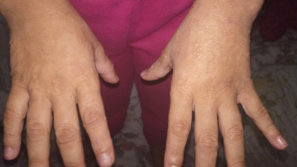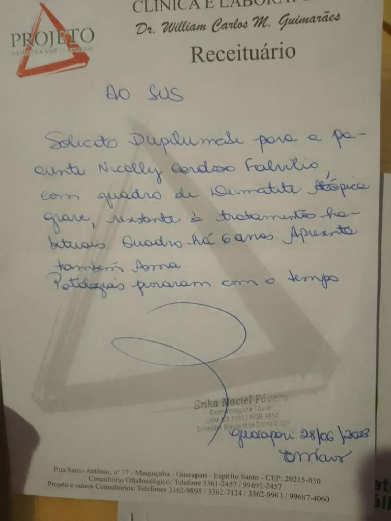 “Desde que ela apresentou a dermatite a gente sempre tratou com corticoides e hidratante corporal. Porém, com o passar do tempo esse tratamento não funcionou mais e as feridas começaram a se agravar a ponto de a gente ter que entrar com antibióticos. A dermatite costuma melhorar com o tempo, mais a dela vem piorando cada vez mais. A dermatologista que acompanha o caso chegou à conclusão, junto com os resultados dos exames, que a única medida agora é entrar com a injeção Dupilumabe, um imunobiológico que custa em torno de R$ 11.500 cada”, explicou Vanessa Cardoso, mãe de Nicolly.