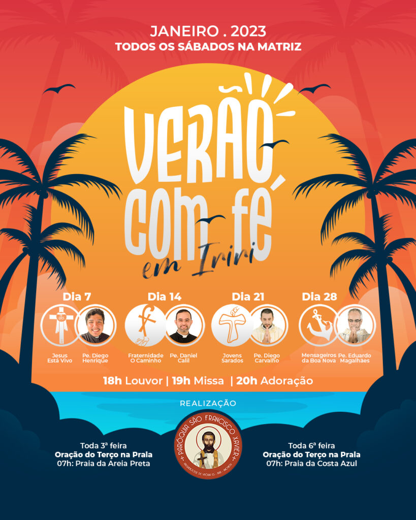 “O Verão com Fé é uma oportunidade de oração no período de descanso. Nossa comunidade preparou com carinho uma programação para acolher a todos os turistas neste tempo de verão e descanso. Aqueles que passarem pelo nosso balneário de Iriri, além de se encantar com as belezas naturais, têm a oportunidade de rezar e fazer também um encontro com Jesus!” declara o Padre Diego Carvalho, administrador paroquial.