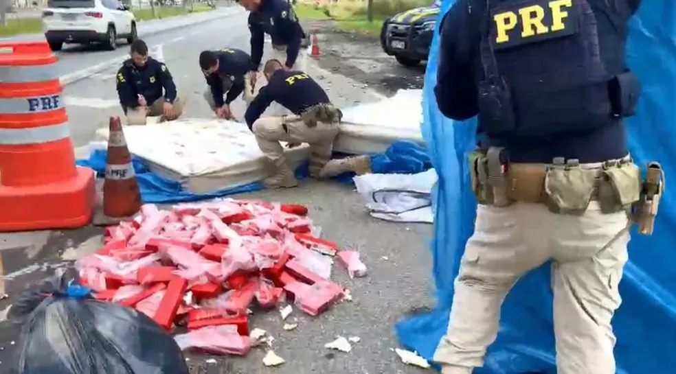 A Polícia Rodoviária Federal (PRF) apreendeu 400 kg de maconha escondidos dentro de colchões na BR-101, em Rio Bonito, na manhã desta quarta-feira (9).
