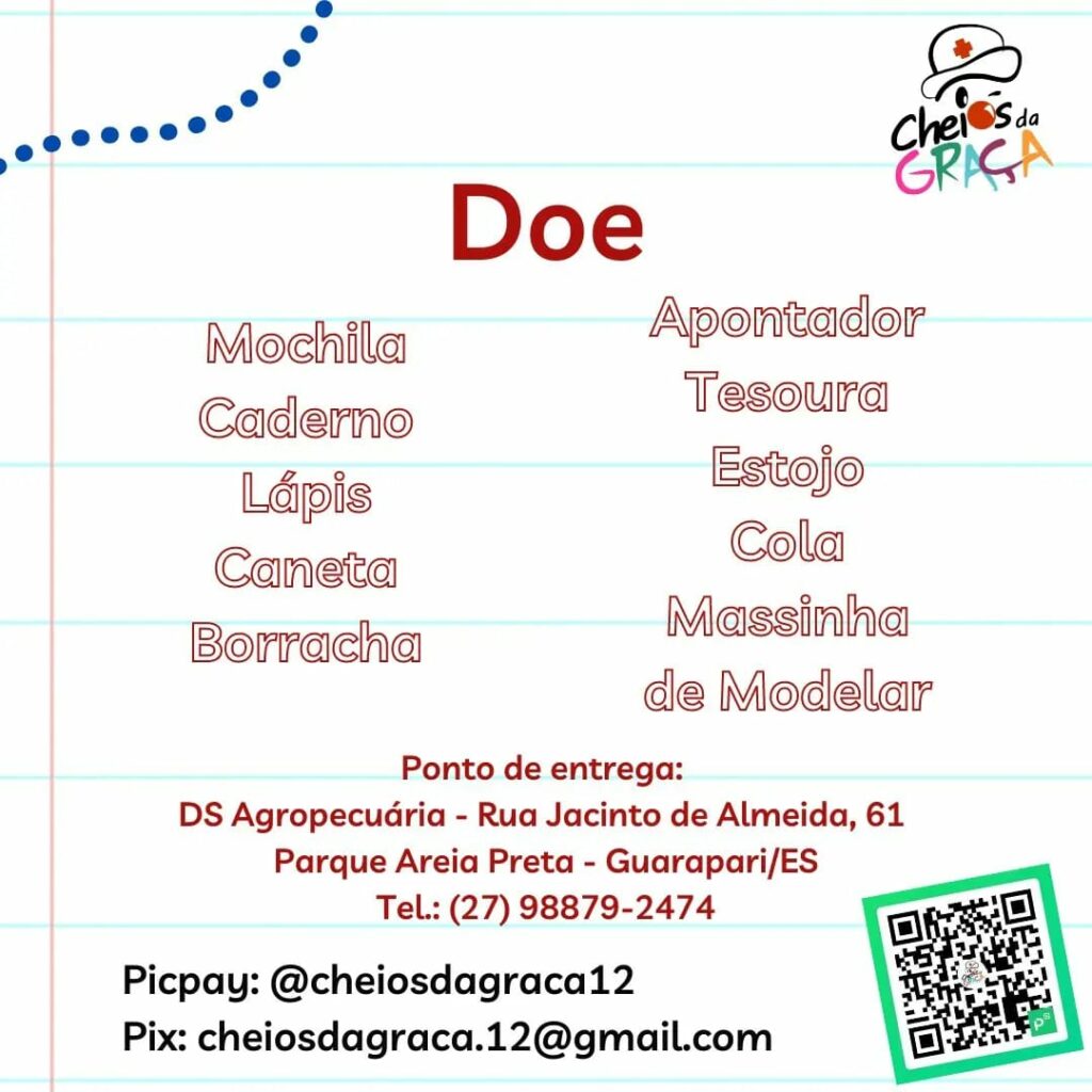 As maiores necessidades são: mochila, caderno, lápis, borracha, caneta, apontador, tesoura, estojo, cola e massinha de modelar. Os materiais devem ser entregues na DS Agropecuária, no Parque da Areia Preta, até dia 05 de fevereiro. As doações também podem ser realizadas em dinheiro através do Pix ou PicPay.