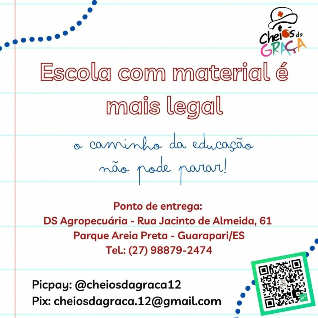 O grupo de voluntários de Guarapari, “Cheio da Graça”, está lançando a quarta edição da campanha “Escola com material é mais legal”. A ação visa arrecadar o maior número possível de material escolar novo para as crianças carentes assistidas pelo grupo.